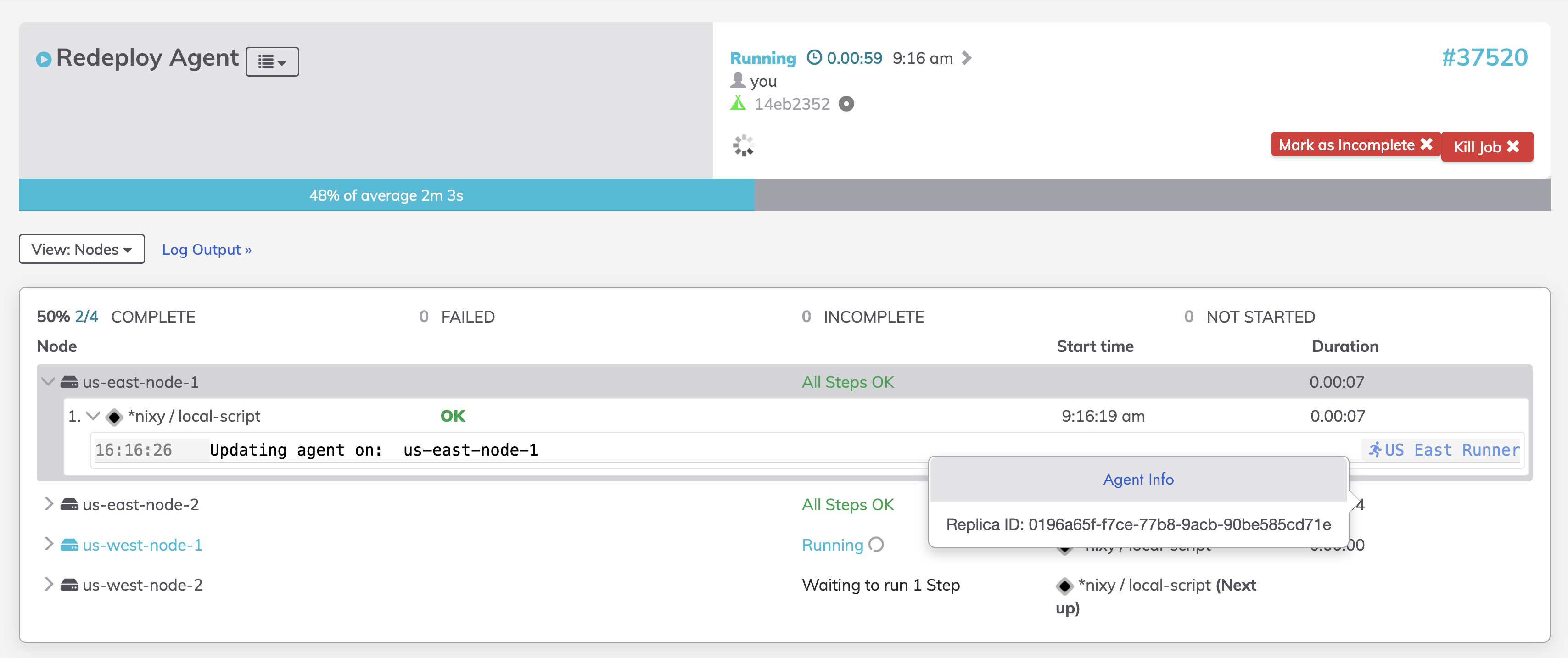 As the Job executes, the log-output of the node-steps for the Job will show the Runner that was used for the step, and clicking on the Runner name will show the specific Replica ID that was used for the step: