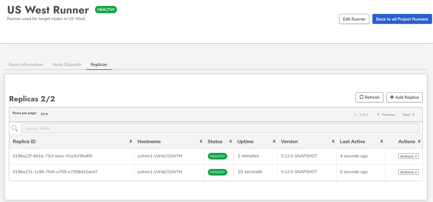 - Version Alignment: When Replicas for a given Runner differ in agent version, then a warning is shown in the GUI informing the user that it is best practice to keep Replicas in aligned with the same version.